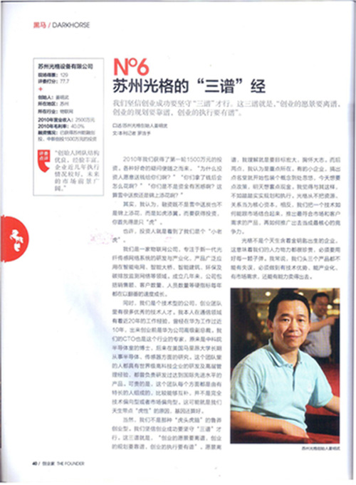 《創業家》雜志報道了《黑馬十強 No6蘇州光格的“三譜”經》