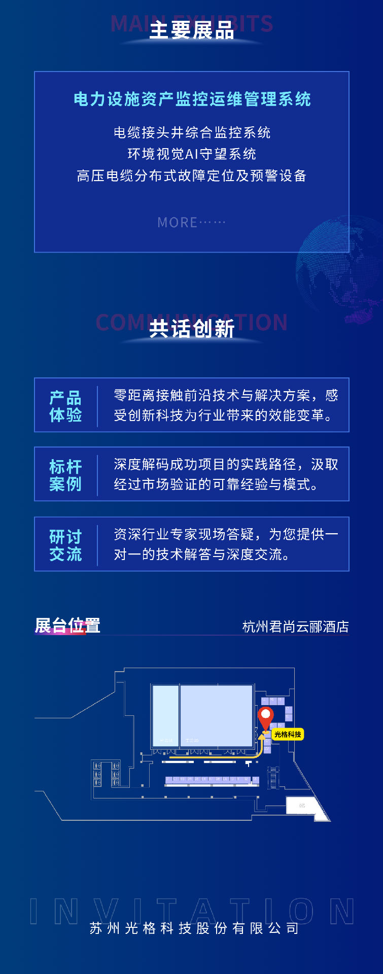 光格科技將攜電力設(shè)施資產(chǎn)監(jiān)控運(yùn)維管理系統(tǒng)亮相大會(huì),重點(diǎn)推介電纜接頭井綜合監(jiān)控系統(tǒng)、環(huán)境視覺(jué)AI模型守望系統(tǒng)、高壓電纜分布式故障定位設(shè)備等一系列創(chuàng)新成果。誠(chéng)邀您撥冗蒞臨展位,交流指導(dǎo),共話未來(lái)!