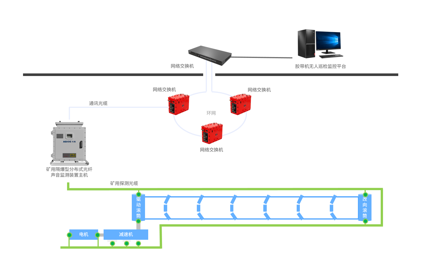膠帶機振動監測系統以分布式光纖振動與聲學傳感技術為核心,通過在膠帶機兩側敷設探測光纜,對托輥、驅動裝置、轉接料斗等關鍵設施實現運行狀態連續感知與智能診斷,為煤礦行業無人化巡檢落地及主動安全防控體系構建提供核心技術支撐。