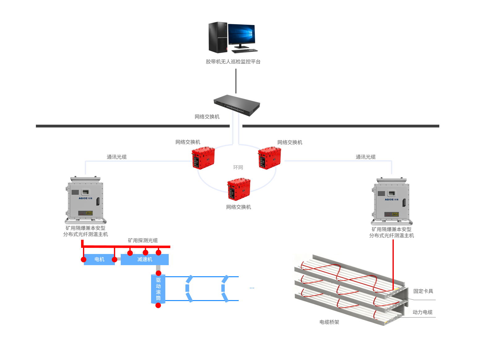 、電纜安全全域監測:對膠帶機沿線橋架電纜進行全路徑、高密度實時測溫,突破傳統人工巡檢盲區,高效覆蓋隱蔽區域,及早識別電纜過熱及火災隱患。